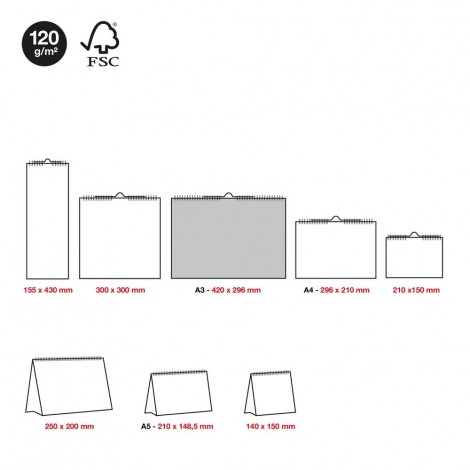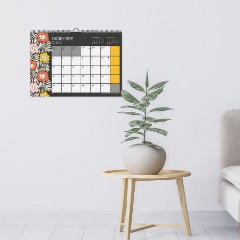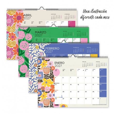Calendario escolar ilustrado de pared con espiral doble. Anualidad: Calendario escolar 12 meses: Septiembre 2026-Agosto 2027. Papel: 180 g/m², FSC Mix Credit. Idiomas: Castellano Tamaño: PARED: A3 (420 x 297 mm.) con espacio para anotar. Contenido: A3 Un mes por página con festivos, fases lunares y y cambios de horario. Calendario de 12 meses en el dorso de cada mes. Incluye 1 página de pegatinas. Encuadernación: espiral doble con pieza para colgar. Presentación: retractilado individual.