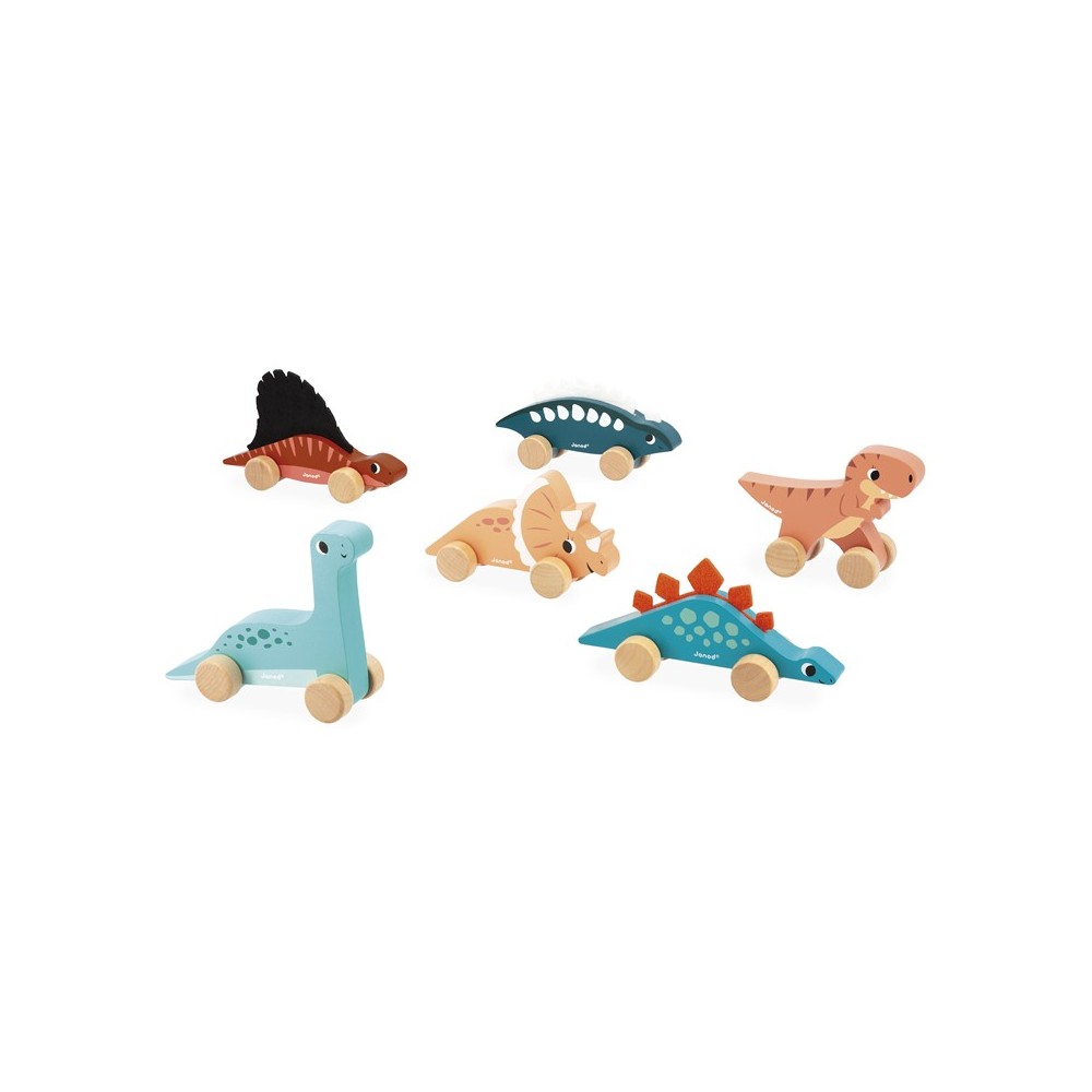 1 dinosaurio, 2 dinosaurios, 3 dinosaurios… ¡Colecciónalos todos! El Stegosaurus y el Ankylosaurus con sus impresionantes placas óseas de fieltro en el lomo. El Triceratops con sus grandes cuernos. El Diplodocus reconocible gracias a su gran cuello. El Tyrannosaurus rex y sus grandes dientes prominentes. El Spinosaurus con una gran vela de fieltro en el lomo. Todos te están esperando para ir de aventuras. Estos dinosaurios para empujar son los compañeros perfectos para pasar largas horas jugando con los más pequeños. Ideal para desarrollar la motricidad fina y la imaginación. Juguete de estimulación de madera FSCTM. Para niños a partir de 12 meses.