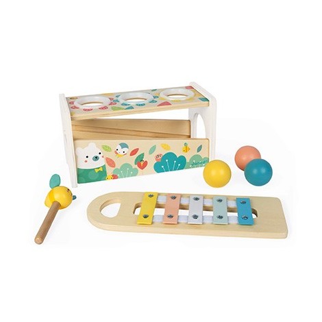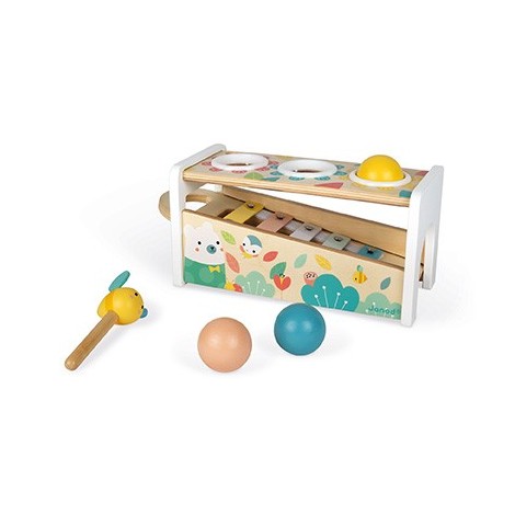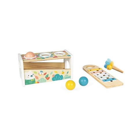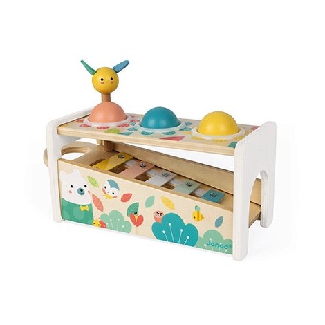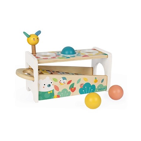 Un bonito juego de habilidad en tonos muy suaves y actuales con encantadores animalitos que permitirá a su hijo desarrollar su destreza mientras se divierte. ¡2 juegos en 1: un mazo de abeja para golpear las 3 bolas que caen haciendo sonar las teclas del xilófono y un xilófono desmontable para poder jugar en cualquier lugar!