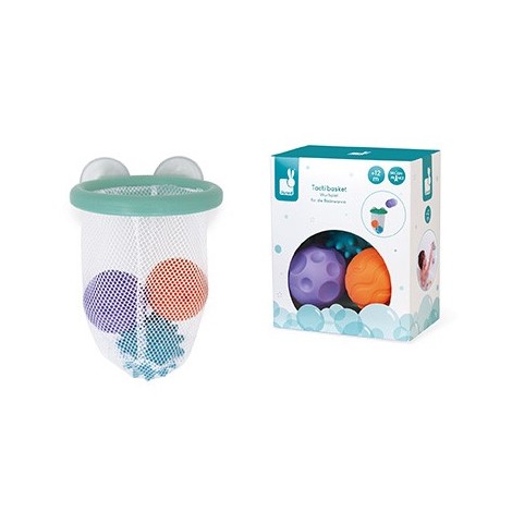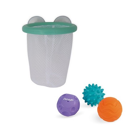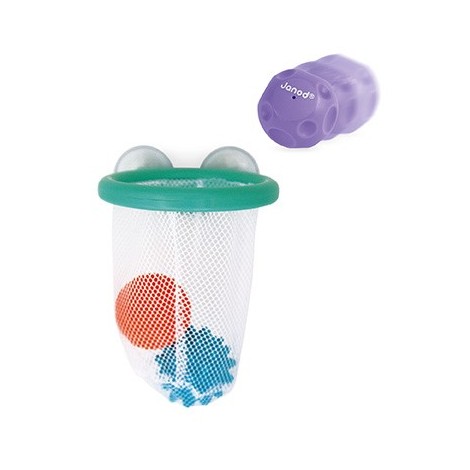 Canasta de baloncesto para el baño para colgarla en los azulejos mediante sus ventosas. Incluye 3 bolas sensoriales para desarrollar la motricidad y la concentración del niño.