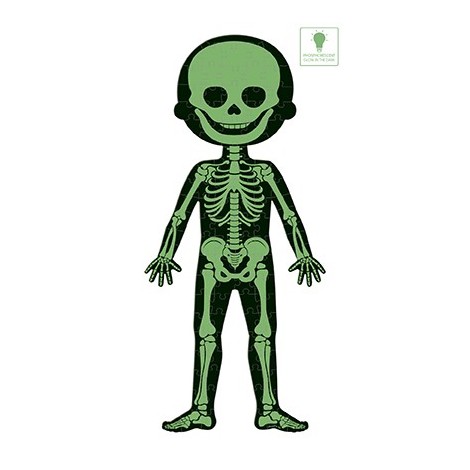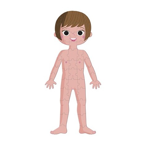 4 puzles gigantes sobre el cuerpo humano 1 puzle por ambas caras de 50 piezas niño/niña 1 puzle de 75 piezas sobre los órganos 1 puzle de 100 piezas fosforescentes sobre el esqueleto Los puzles tienen 1 metro de altura para ayudar a los niños a comprender mejor su cuerpo. El puzle incluye tarjetas educativas detalladas para conocer las distintas partes del cuerpo humano. Disponible en 12 idiomas: Francés, inglés, alemán, holandés, polaco, ruso, español, portugués, catalán, italiano, eslovaco y checo.