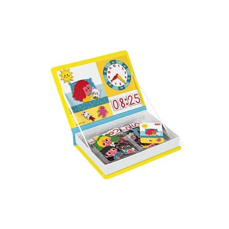 Juego educativo magnético de cartón con la temática del aprendizaje de la hora. Compuesto por 75 imanes y 8 tarjetas impresas por ambas caras (=16 escenas). Una vez se ha abierto el libro, el objetivo del juego es recomponer la escena de la vida cotidiana que indica la tarjeta con ayuda de los imanes. El Magneti'Book es mixto, ya que en cada tarjeta aparece un niño o una niña (anverso: niño, reverso: niña).