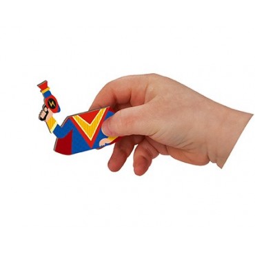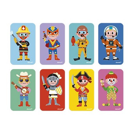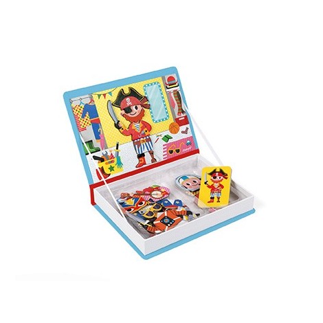 Juego educativo magnético de cartón con la temática de los disfraces para niños. Compuesto por 36 imanes y 8 tarjetas. Una vez se ha abierto el libro, el objetivo del juego es recomponer en la escena el disfraz que indica la tarjeta con ayuda de los imanes.