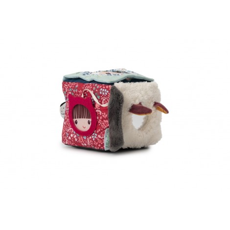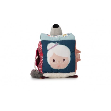 Un cubo colorido con diferentes sonidos, materiales y una sorpresa en cada lado. Las solapas y formas esconden a la Abuelita, el lobo, Caperucita Roja y un cerdito. ¿Y quE ves en el espejo? ¿Una ovejita?