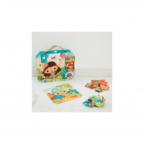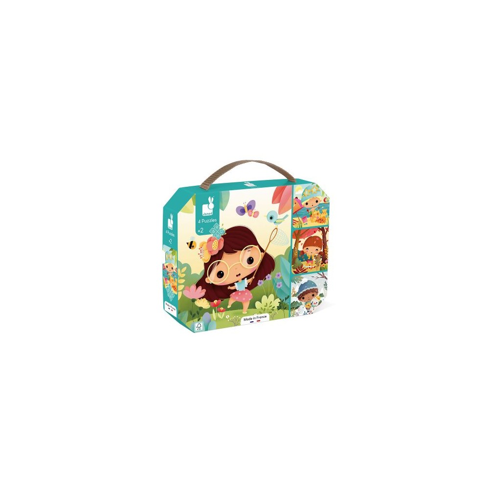 ¡Te espera un viaje por las estaciones del año! Con estos 4 puzles evolutivos sobre el tema de las estaciones, los niños a partir de 2 años exploran las maravillas cambiantes de la naturaleza a lo largo del año. Cada uno de los puzzles, compuestos por 6, 9, 12 y 16 piezas, acompaña al niño en su avance, estimulando así su motricidad fina y su concentración.