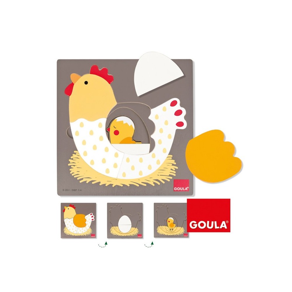 Puzzle de madera Goula con 3 niveles (gallina, huevo, pollito). Con 7 piezas, enseña el desarrollo vital y estimula la motricidad. Ideal para niños de 1 a 4 años.