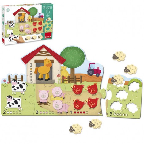 Puzzle educativo Goula 1‑5: tablero numérico y 15 animales de granja para aprender a contar, encajar y asociar desde los 2 años. Ideal para desarrollo sensorial, motor y lógico.