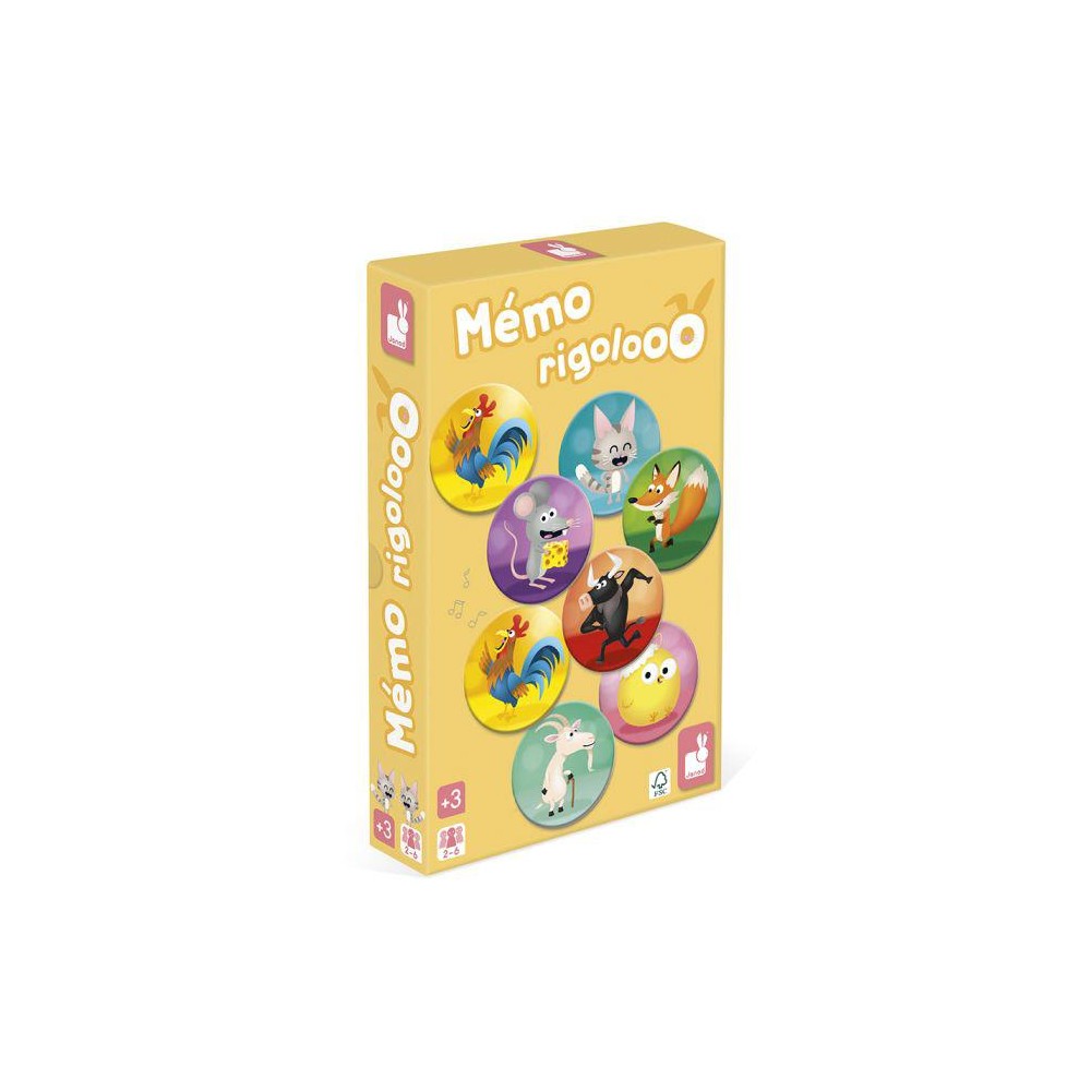 Juego de memoria Memo Rigolooo Janod, con cartas ilustradas de animales. Estimula la memoria visual, concentración y observación. A partir de 3 años.