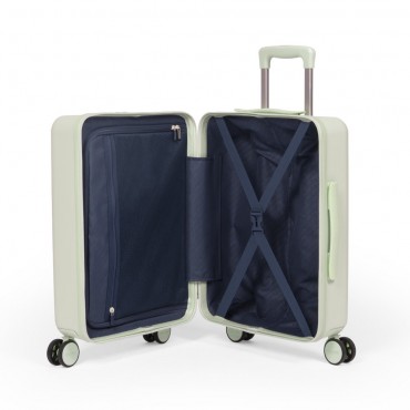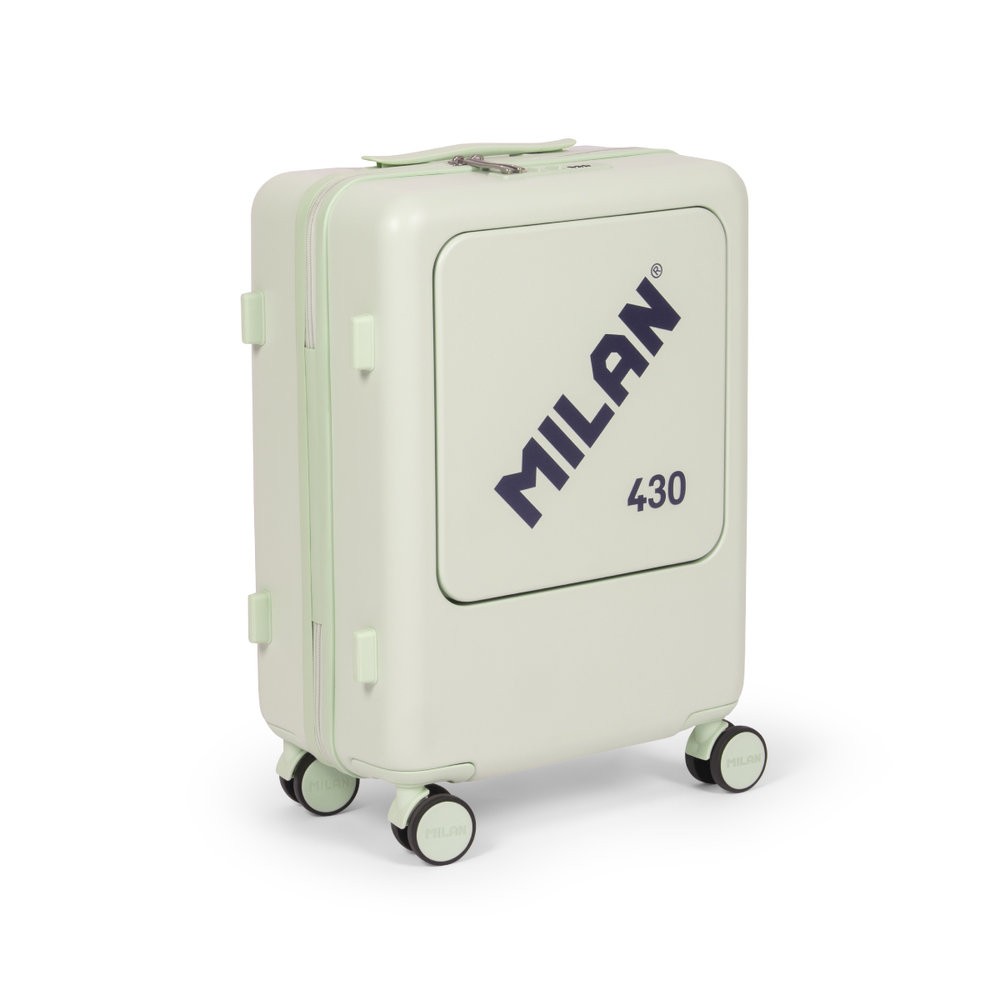 Maleta de viaje ligera y resistente. Ideal como equipaje de mano para llevarla en la cabina del avión, como maleta de fin de semana o viajes cortos. Cierre de cremallera con sistema TSA con combinación de tres dígitos. Dos posiciones para la apertura independiente del compartimento principal y el frontal. Maleta rígida y acabado rugoso exterior para mayor resistencia a las rasgaduras. Cuenta con 4 ruedas dobles giratorias de 360°, silenciosas. Asa superior y lateral para facilitar el manejo de la maleta. Mango telescópico de aluminio con 3 posiciones regulables. Dispone de 2 compartimentos interiores forrados: uno con un bolsillo de malla con cremallera y el otro con cintas elásticas de sujeción. Compartimento frontal con bolsillos interiores para facilitar la organización de objetos pequeños y compartimento protector para portátil de hasta 14´´. Color verde. Colección 430 since 1918, inspirada en los colores y diseño originales de las gomas de borrar MILAN, fabricadas en España desde