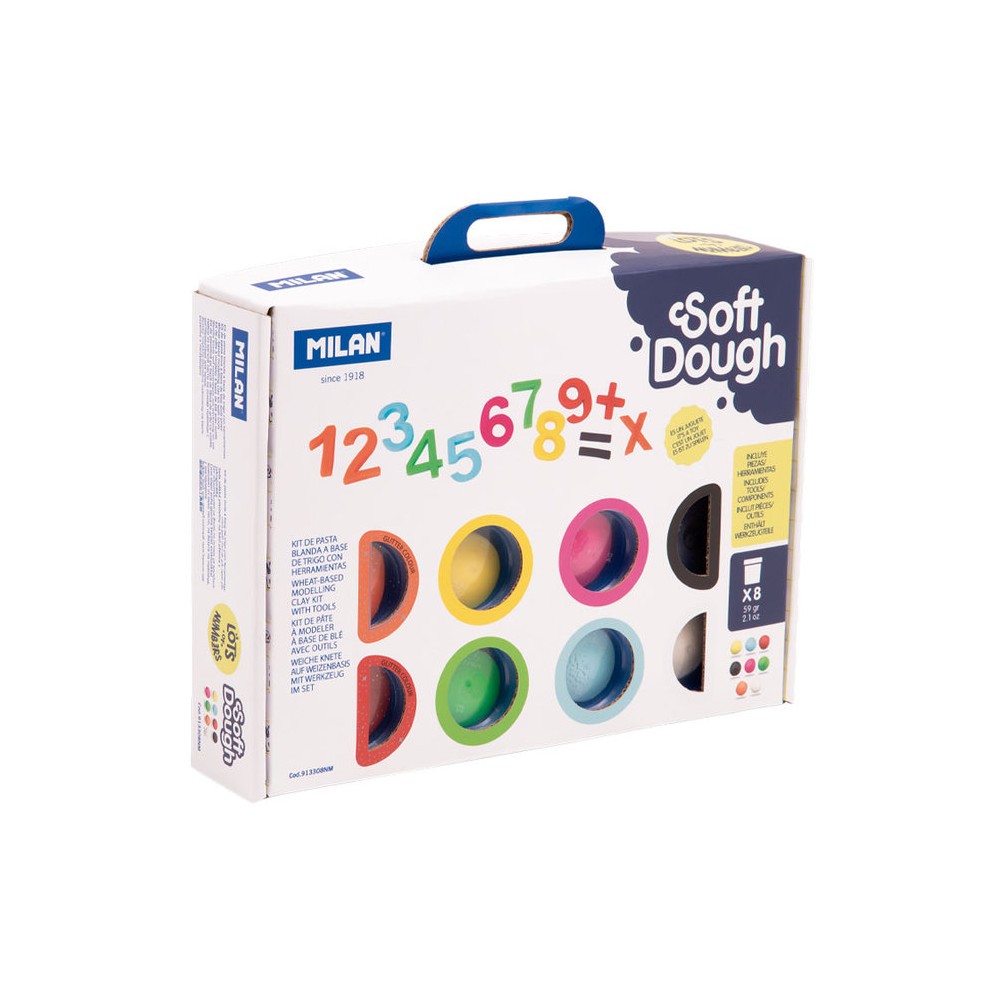 Kit de pasta blanda a base de harina de trigo con herramientas ´Números´. Para aprender los números y las primeras operaciones. Contenido del maletín: 8 botes de 59 g (de color blanco, amarillo, naranja, rojo, azul claro, verde, rosa y negro), 15 moldes de números y símbolos matemáticos y 3 herramientas. Soft Dough es una pasta consistente y elástica, fácil de modelar y reutilizable. Se pueden crear nuevos tonos combinando dos o más colores. No deja residuos en las manos. Ingredientes de origen vegetal (contiene gluten). Este juguete fomenta la creatividad y el desarrollo de la psicomotricidad fi