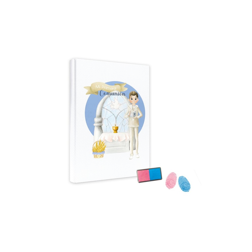 LIBRO COMUNION HUELLAS NIÑO ALTAR ENCUADERNACIÓN CARTONÉ 44 PÁGINAS A TODO COLOR DE LAS CUALES 20 PÁGINAS PARA PEGAR TUS FOTOS INCLUYE TAMPÓN DE 2 COLORES MEDIDAS: 29 X 24 CM.