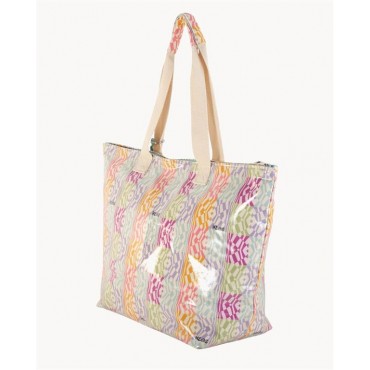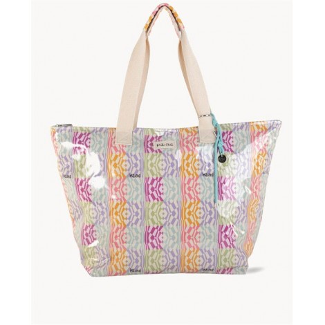 El bolso está fabricado en lona plastificada impermeable, ideal para proteger tus pertenencias frente a la arena y la humedad. Su gran capacidad permite transportar todo lo necesario para la playa o piscina: toalla, ropa, cremas y accesorios.