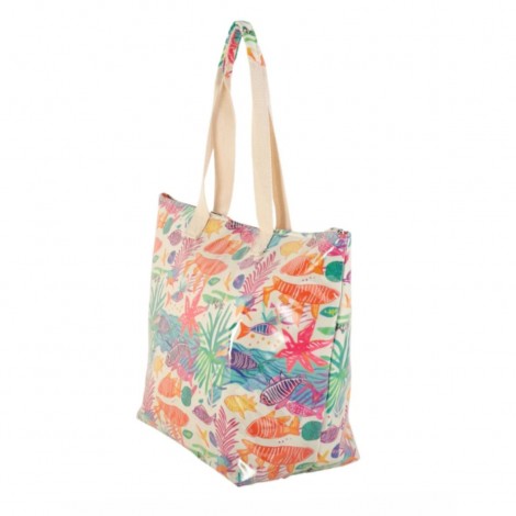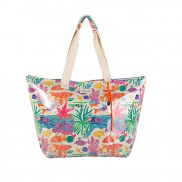 El bolso está fabricado en lona plastificada impermeable, ideal para proteger tus pertenencias frente a la arena y la humedad. Su gran capacidad permite transportar todo lo necesario para la playa o piscina: toalla, ropa, cremas y accesorios.
