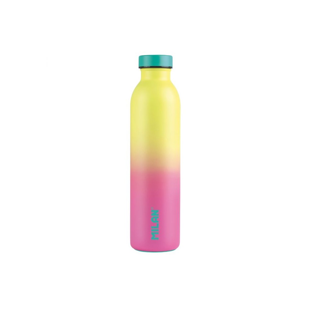 Botella isotérmica de acero inoxidable. Serie Sunset, color amarillo-rosa. Capacidad: 591 ml. Botella isotérmica con doble pared de acero inoxidable. Aislamiento al vacío que evita la condensación y permite que la parte exterior mantenga la temperatura ambiente. Mantiene la temperatura del líquido contenido (hasta 12 h bebidas calientes y 24 h bebidas frías). Tapón de rosca hermético, con junta de polipropileno. Base de silicona antideslizante. We protect: el uso de botellas reutilizables contribuye a reducir el consumo de plástico con las botellas desechables de un solo uso.