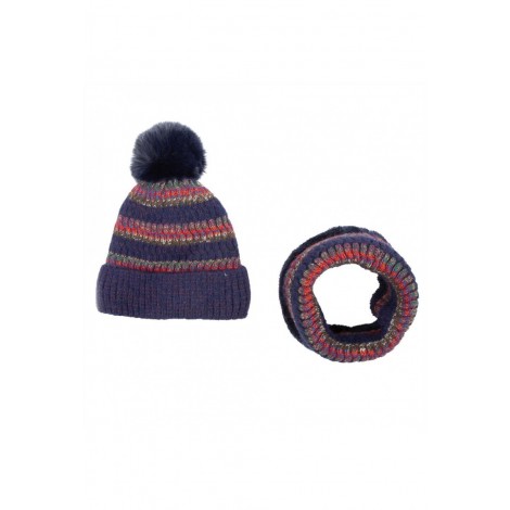 Conjunto de gorro y cuello ambos con pelo interior en multi rayas y con pompón de pelo.