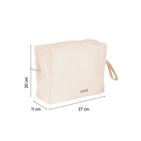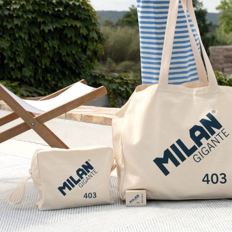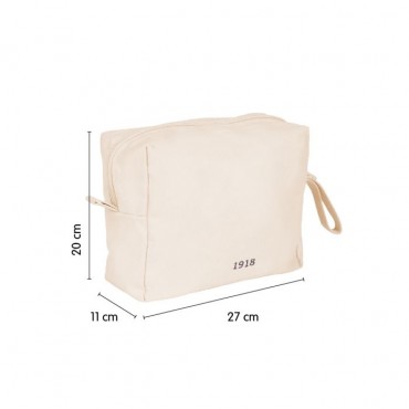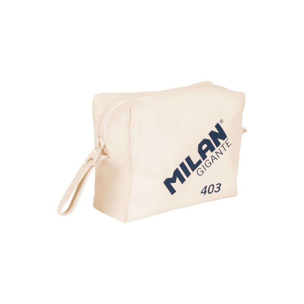 Neceser grande de color beige ideal para organizar y llevar artículospersonales y maquillaje, tanto para viajes como para uso diario. Cierrecon cremallera. Incluye dos compartimentos interiores y un asa de mano. Logotipo de la colección de color azul marino. La colección 403 MILANGIGANTE since 1918 está inspirada en los colores y diseño originales delas gomas de borrar MILAN, fabricadas en España desde 1918. Composicióndel tejido: 100% algodón. Se puede combinar con el bolso tote bag grandede la misma colección. Medidas: 27 x 20 x 11 cm. Cuidados: Lavado a manomáx. 30°, no planchar, no usar secadora, no usar lejía.