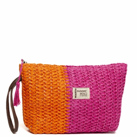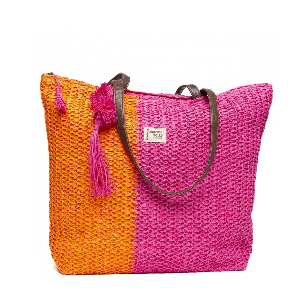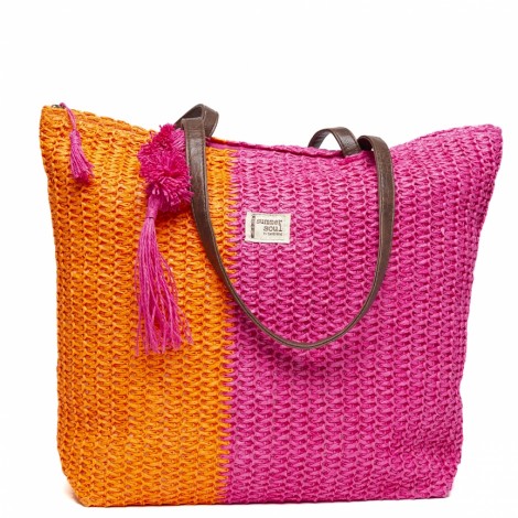 TANTREND – CONJUNTO DE PLAYA BICOLOR CON BOLSO Y NECESER EN TEJIDO TIPO RAFIA CON BORLAS