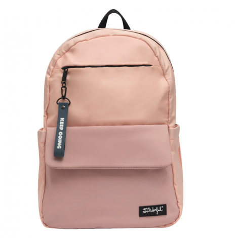 Mochila soft Mr. Wonderful “Keep Going” en color rosa. Ligera, cómoda y práctica, con cinta para maleta y mensaje inspirador.