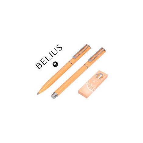 JUEGO BOLIGRAFO Y ROLLER BELIUS ENDLESS SUMMER ALUMINIO COLOR NARANJA Y PLATEADO TINTA AZUL CAJA DE DISEÑO