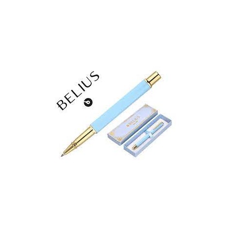 BOLIGRAFO BELIUS MACARON BLISS FORMA HEXAGONAL COLOR CELESTE Y DORADO TINTA AZUL CAJA DE DISEÑO