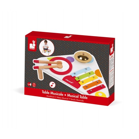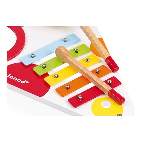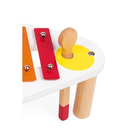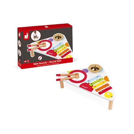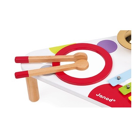 Juguete de madera. Para niños de 12 a 36 meses. Se trata de una mesa musical que consta de un xilófono, un platillo y un tambor con dos baquetas. ¡¡¡Roja, amarilla, verde, naranja... !!! ¡Confetti es una gama completa de juguetes musicales decorados al estilo Pop N’ Rock! Confetti ayuda a activar todos los sentidos y permite a los pequeños aprendices de músico a hacer sus pinitos en el mundo de la improvisación musical.