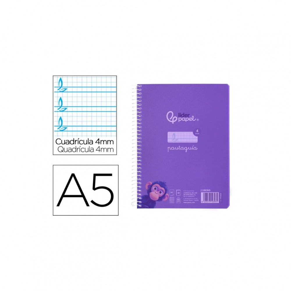 Cuaderno espiral liderpapel din a5 pautaguia tapa plastico 80h 90gr cuadro pautado 4 mm con margen color lila.