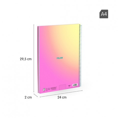 Cuaderno A4 con espiral metálica y tapa dura. 90h de papel cuadriculado (5 x 5 mm) con 3 bandas de colores (30h por color). Papel de 95gr/m² de alta calidad, microperforado y con 4 taladros. Iniciador de corte para facilitar la separación de cada hoja. Cubierta de cartón rígido y logotipo MILAN brillante en relieve. Espiral flexible con cierre de seguridad que evita enganches con la ropa o rayaduras en muebles. Color rosa. Colección Sunset: una combinación de colores degradados inspirados en el atardecer mediterráneo, acompañados de detalles en blanco y negro. Medida A4: 29,5 x 24 x 2 cm.