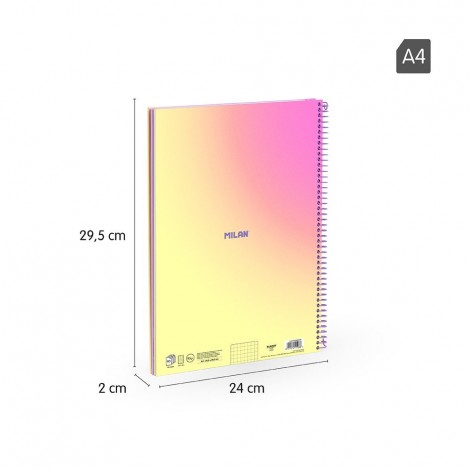 Cuaderno A4 con espiral metálica y tapa dura. 90h de papel cuadriculado (5 x 5 mm) con 3 bandas de colores (30h por color). Papel de 95gr/m² de alta calidad, microperforado y con 4 taladros. Iniciador de corte para facilitar la separación de cada hoja. Cubierta de cartón rígido y logotipo MILAN brillante en relieve. Espiral flexible con cierre de seguridad que evita enganches con la ropa o rayaduras en muebles. Color rosa. Colección Sunset: una combinación de colores degradados inspirados en el atardecer mediterráneo, acompañados de detalles en blanco y negro. Medida A4: 29,5 x 24 x 2 cm.