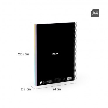 Cuaderno A4 con espiral metálica y tapa dura. 90h de papel cuadriculado (5 x 5 mm) con 3 bandas de colores (30h por color). Papel de 95gr/m² de alta calidad, microperforado y con 4 taladros. Iniciador de corte para facilitar la separación de cada hoja. Cubierta de cartón rígido y logotipo MILAN brillante en relieve. Espiral flexible con cierre de seguridad que evita enganches con la ropa o rayaduras en muebles. Color rosa. Colección Sunset: una combinación de colores degradados inspirados en el atardecer mediterráneo, acompañados de detalles en blanco y negro. Medida A4: 29,5 x 24 x 2 cm.