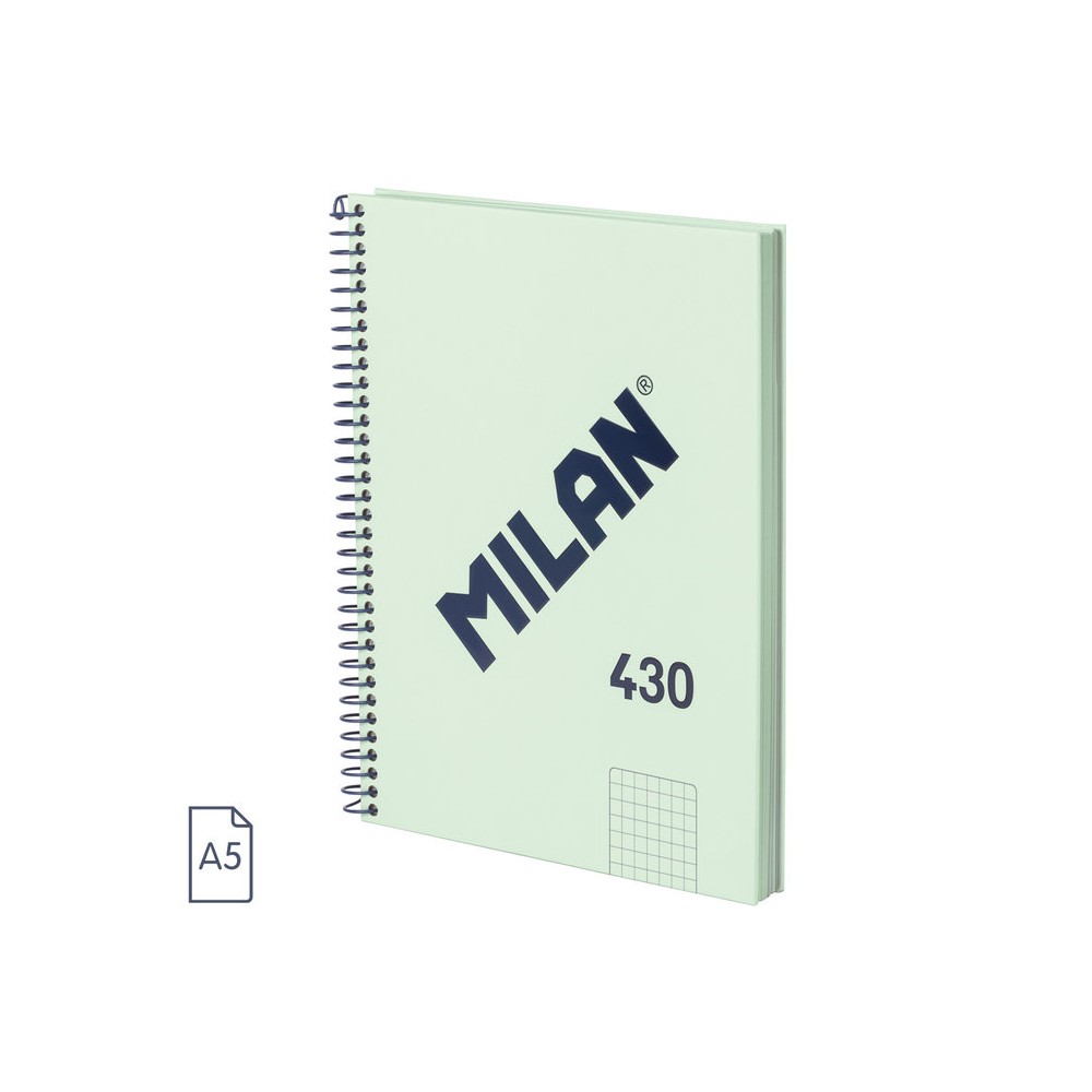 Cuaderno A5 con espiral metálica y tapa dura. 80 hojas de papel cuadriculado (5 x 5 mm). Papel de 95 gr/m² de alta calidad, microperforado y con 4 taladros. Iniciador de corte para facilitar la separación de cada hoja. Cubierta de cartón rígido y logotipo MILAN brillante en relieve. Espiral flexible con cierre de seguridad que evita enganches con la ropa o rayaduras en muebles. Color verde. Colección 430 since 1918, inspirada en los colores y diseño originales de las gomas de borrar MILAN, fabricadas en España desde 1918.