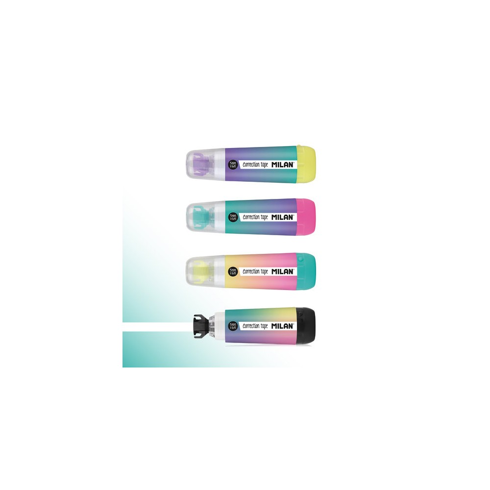 Cinta correctora en seco cilíndrica, serie Sunset. Apta para zurdos gracias a la rotación de 360º de su punta. Rápida, limpia y precisa. Correcciones sobre todo tipo de papel, no deja marcas en fotocopias o fax. 5 mm de ancho x 6 m de largo. Colores surtidos: negro, verde, rosa y amarillo. Serie Sunset: una combinación de colores degradados inspirados en el atardecer, acompañados de detalles en blanco y negro. Recambios de la cinta correctora disponible en formato blíster ref. BWM10467.