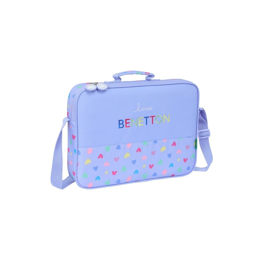Cartera escolar Benetton en color lila. Diseño sencillo, moderno y funcional. Con correa ajustable y cremallera. Ideal para clase, actividades o uso diario.