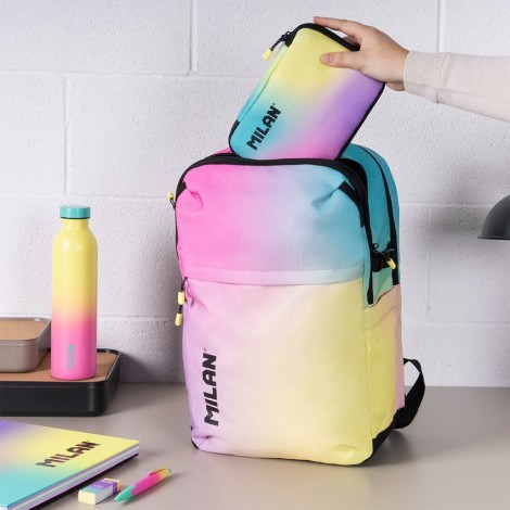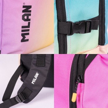 Mochila escolar y urbana con cinco cremalleras. Diseñada para ofrecer espacio y organización. Práctica para el día a día, para estudiantes, trabajo, escapadas, viajes y actividades al aire libre. Cuenta con un compartimento principal con cinta de seguridad para dificultar su apertura. Dos bolsillos delanteros con cierre de cremallera y dos cintas para colgar accesorios. Cuenta también con un compartimento acolchado para portátil de hasta 16? y un bolsillo trasero de seguridad. Dos bolsillos laterales de fácil acceso que pueden utilizarse como porta-botellas y una tira lateral ajustable para colgar pertenencias. El bolsillo delantero superior incluye un separador interior para organizar objetos pequeños. Asas acolchadas regulables con cintas para colgar accesorios. Base reforzada. Permite añadir un carrito porta-mochilas. Colección Sunset: una combinación de colores degradados inspirados en el atardecer mediterráneo, acompañados de detalles en blanco y negro.COLOR TURQUESA