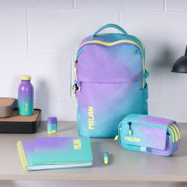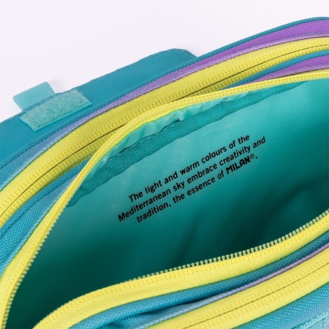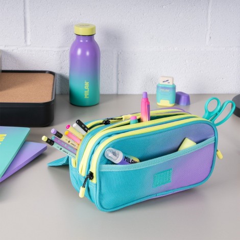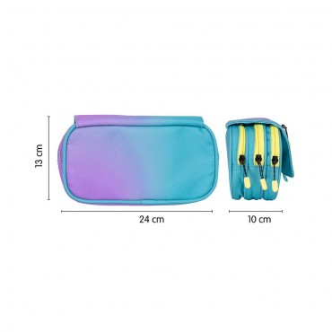 Estuche portatodo degran capacidad con 3 bolsillos con cremallera y un pequeño bolsillo frontal en la solapa. Cierre de botón a presión. Color turquesa. Colección Sunset: una combinación de colores degradados inspirados en el atardecer mediterráneo, acompañados de detalles en blanco y negro. Tiradores de las cremalleras con cuerda. Composición tejido: poliéster. Medidas: 13 x 24 x 10 cm.