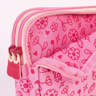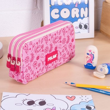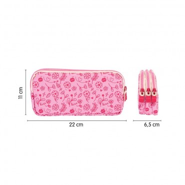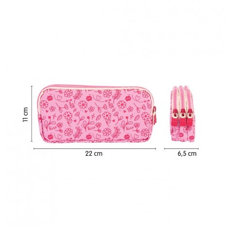Estuche escolar portatodo con 3 amplios compartimentos que permiten repartir el contenido. Colección Flowicorn con diseños de unicornios, flores y corazones en tonos rosados y azules, que invita a soñar e imaginar historias de fantasía. Composición tejido: poliéster. Medidas: 22 x 11 x 6,5 cm.