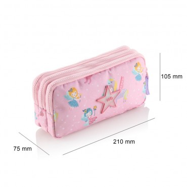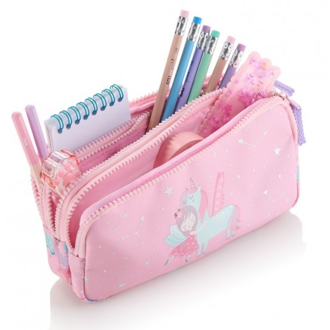 Cuenta con tres compartimentos independientes con cremallera, ideales para organizar bolígrafos, lápices, rotuladores y pequeños accesorios. Es perfecto para estudiantes que necesitan tener todo ordenado y accesible.