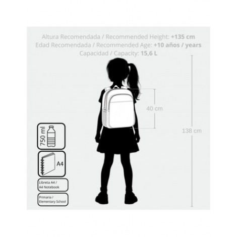 Cuenta con 2 compartimentos principales con cremallera, ideales para organizar libros, cuadernos y material escolar. Su tamaño de 40 cm la hace perfecta para primaria.
