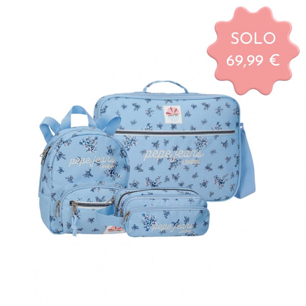 PACK OLIVIA PEPE JEANS AZUL CLARO MOCHILA 23 CM + CARTERA EXTRAESCOLAR + PORTATODO 5 COMPARTIMENTOS