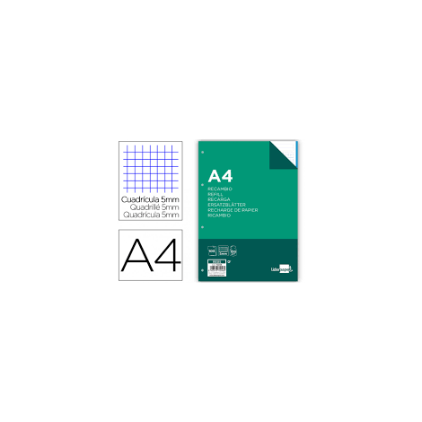 Recambio Liderpapel A4 con cuadrícula de 4 mm y margen. Papel blanco 100 g/m², sin filo de color. Taladro lateral compatible con carpesanos.