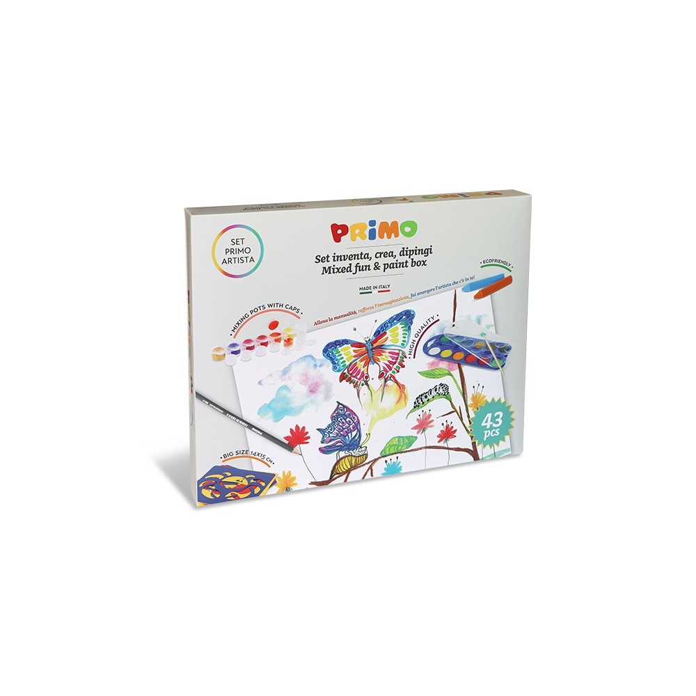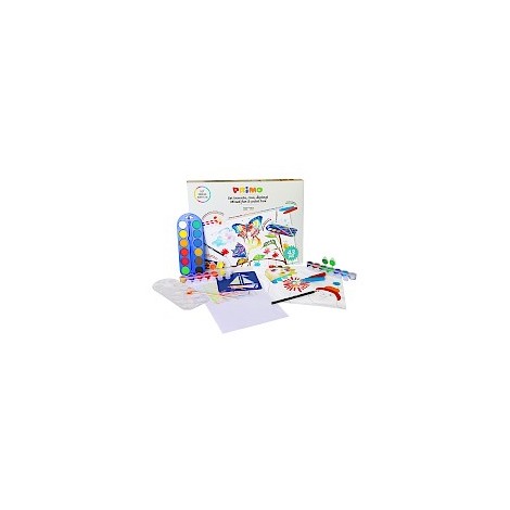 Set Inventa, crea y pinta: 12 acuarelas de Ø 30 mm, 8 ceras Jumbo, témperas de alta calidad en 14 colores, 1 pincel, 1 lápiz HB, 6 plantillas.