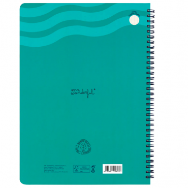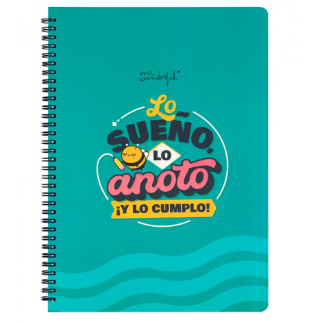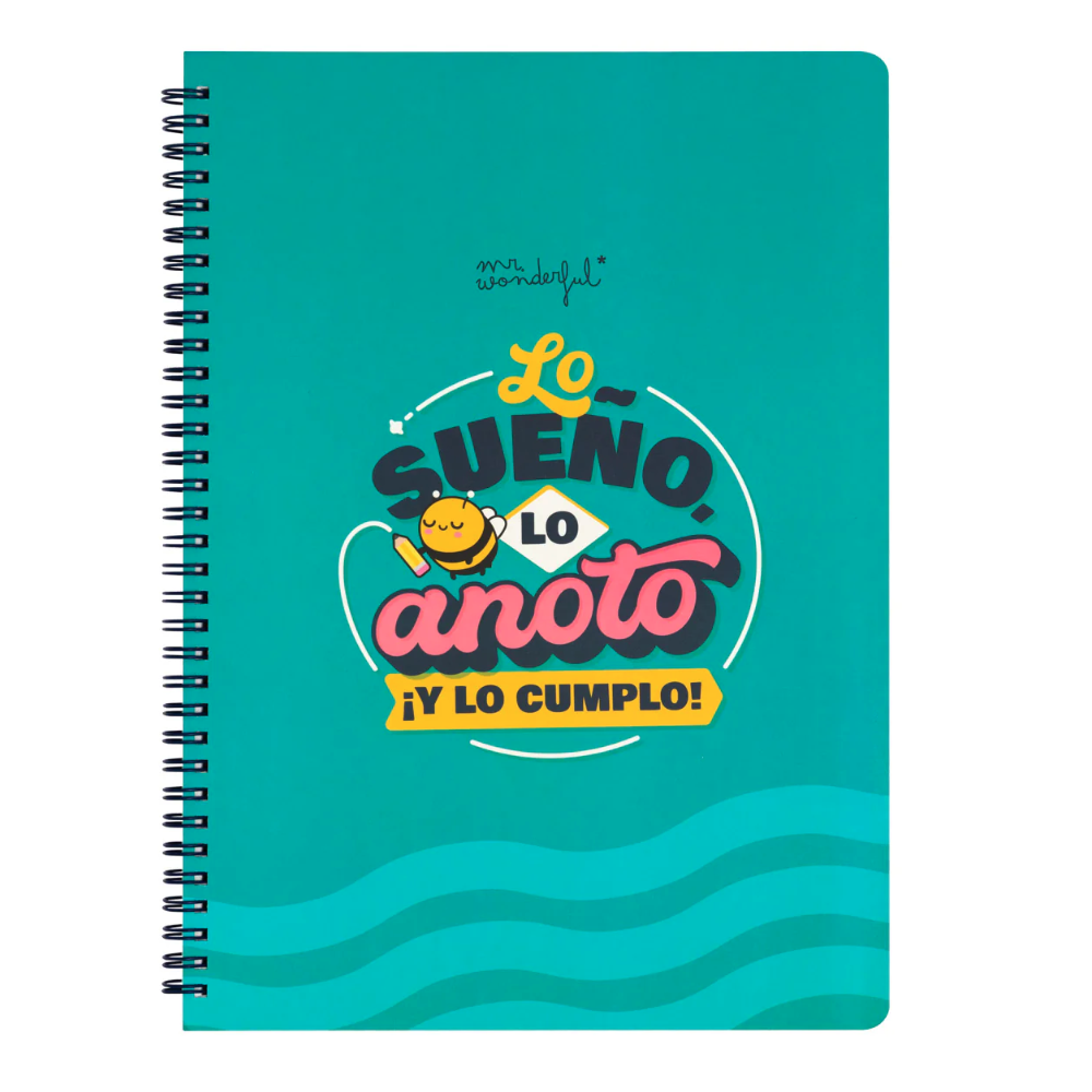Libreta A4 Mr. Wonderful “Lo sueño, lo anoto ¡y lo cumplo!”. 100 páginas rayadas, tapa dura y espiral metálico. Ideal para organizar ideas con actitud.