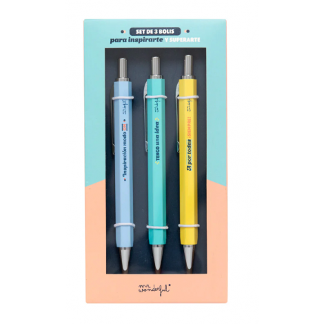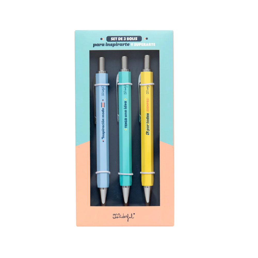 SET DE 3 BOLÍGRAFOS MR. WONDERFUL – "PARA INSPIRARTE Y SUPERARTE"