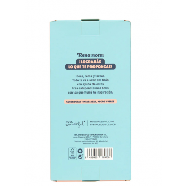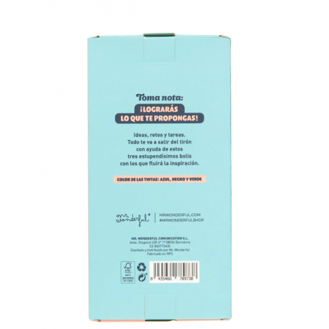El set de 3 bolígrafos Mr. Wonderful “Para inspirarte y superarte” está pensado para acompañarte en tus mejores ideas, tus metas diarias y tus momentos más creativos. Cada bolígrafo tiene tinta negra y está decorado con frases motivadoras que te impulsarán a seguir adelante con buen humor y actitud positiva. Vienen presentados en un estuche ilustrado, perfecto tanto para uso personal como para regalar a quienes aman la papelería con mensaje.