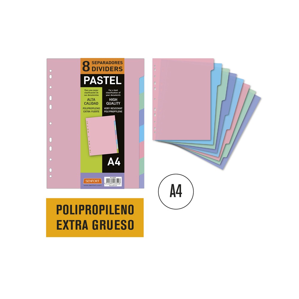 JUEGO DE 8 SEPARADORES A4 MULTITALADRO DE POLIPROPILENO EXTRA GRUESO – COLORES PASTEL – SENFORT