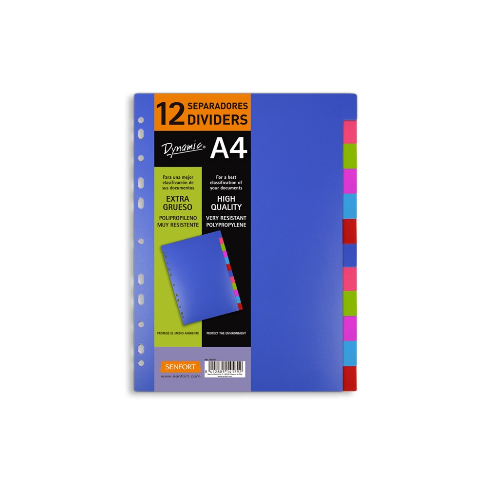 JUEGO DE 12 SEPARADORES A4 MULTITALADRO DE POLIPROPILENO EXTRA GRUESO – COLORES VARIADOS – SENFORT