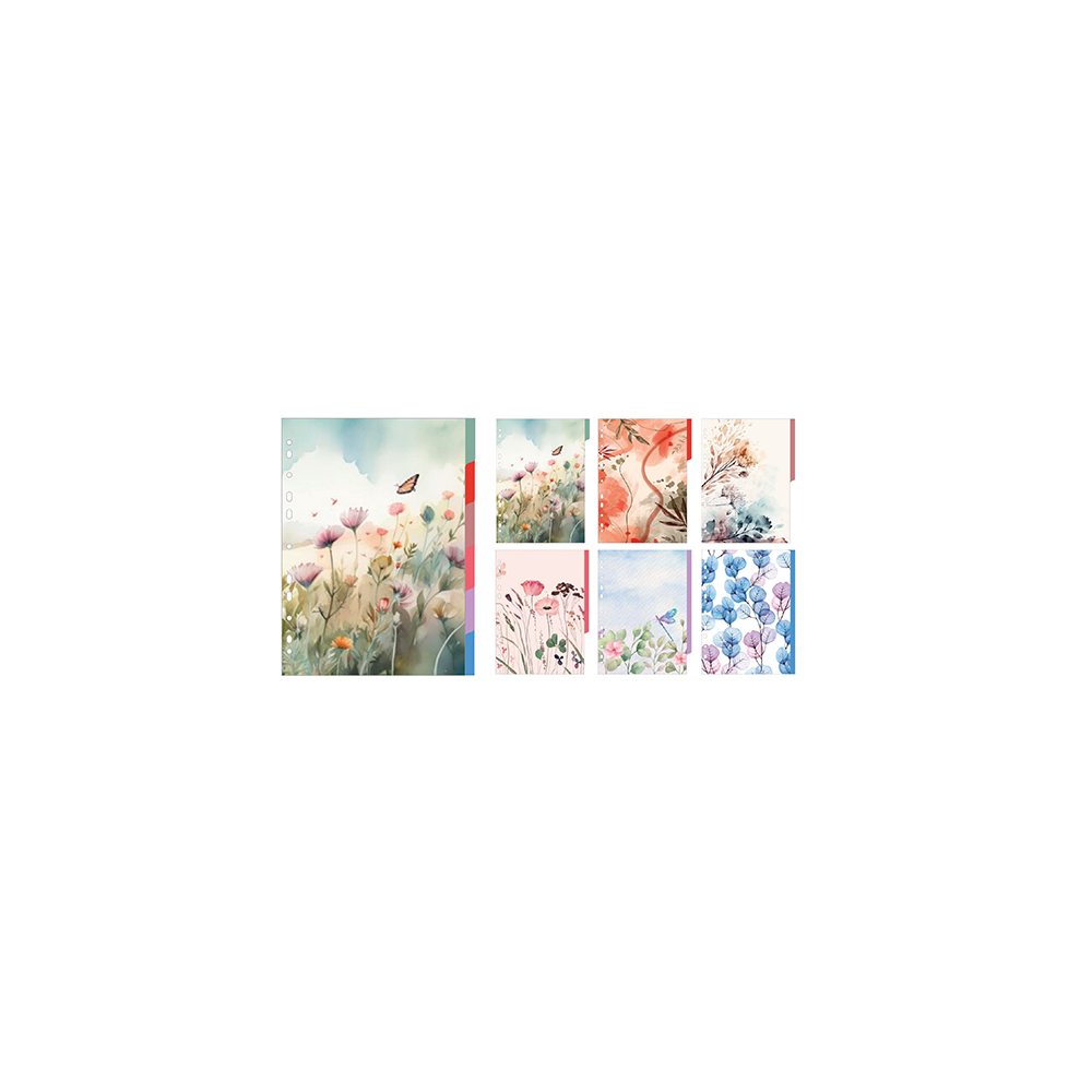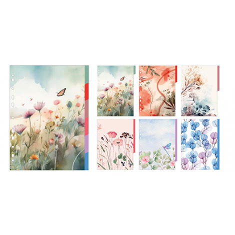 Juego de 6 separadores A4 de cartón multitaladro decorado con diseños de flores y mariposas en acuarela. Un toque elegante y primaveral para tu organización diaria.
