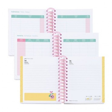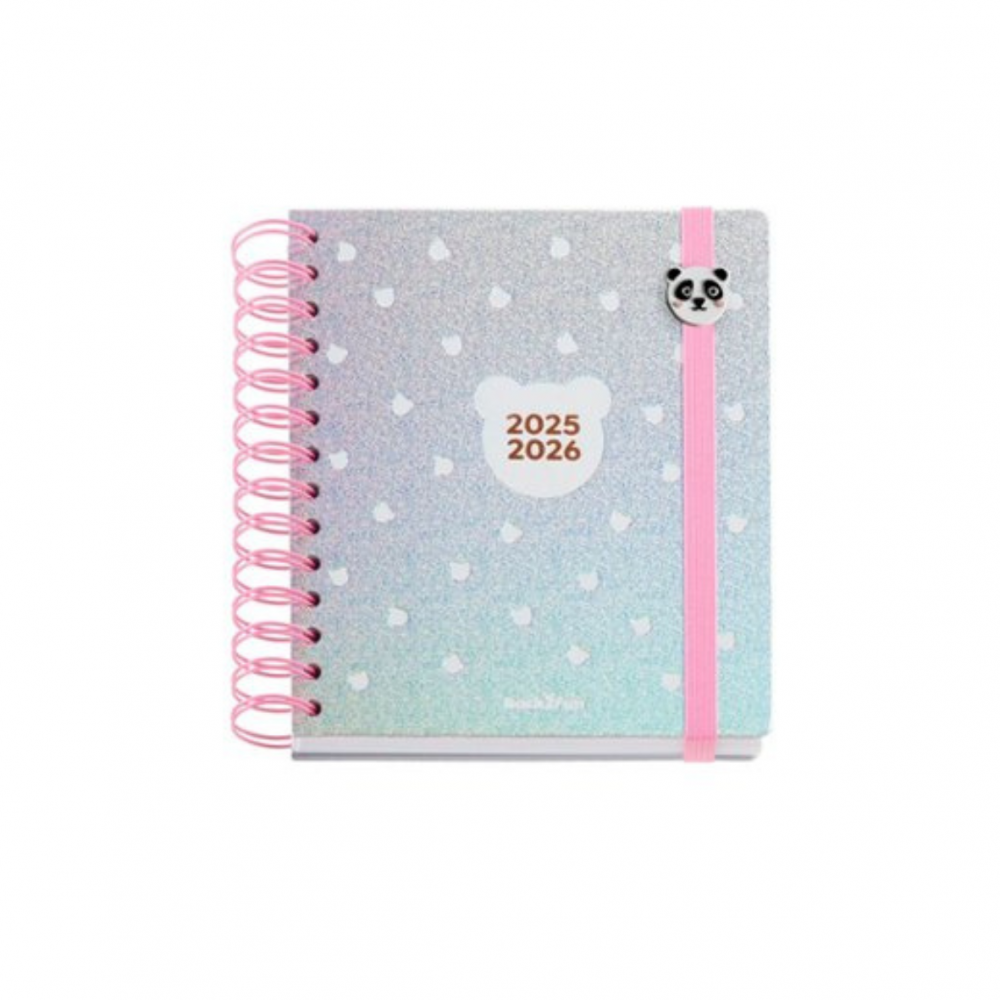 agenda escolar MIQUEL RIUS 2025-2026 modelo MR26611 con tapa dura decorada con GLITTER PLATA. formato día página para un curso bien planificado. incluye cierre con goma, marcapáginas de tela y adhesivos para personalización. papel resistente y diseño moderno.