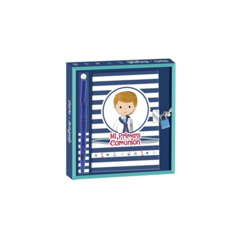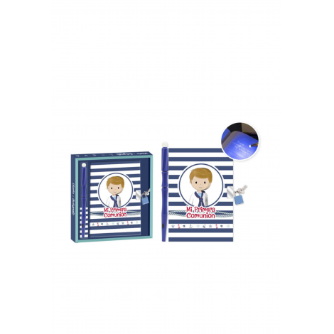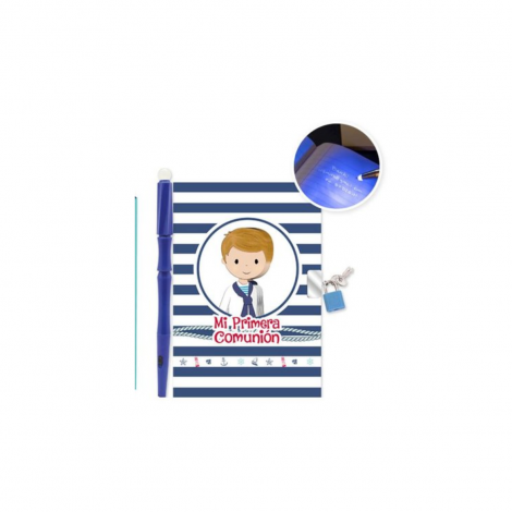 Set Diario Secreto "Mi Primera Comunión" para niño, incluye diario con 50 hojas, candado con llave y bolígrafo con luz. Un recuerdo confidencial y divertido de su comunión.