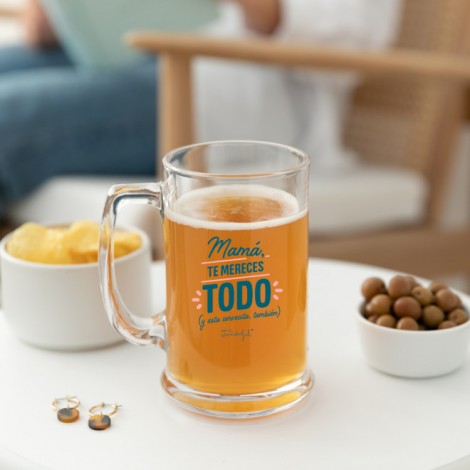 Jarra de cerveza Mr. Wonderful con frase “Mamá, te lo mereces todo y un poquito más”. Un regalo divertido, bonito y funcional.