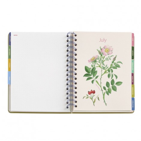 Cuenta con un diseño Jardín Entredos, encuadernación Wire-O que facilita una apertura total y páginas de papel de alta calidad que evitan el traspaso de tinta. Además, incluye planificadores mensuales, calendarios anuales y espacio adicional para notas y recordatorios importantes.